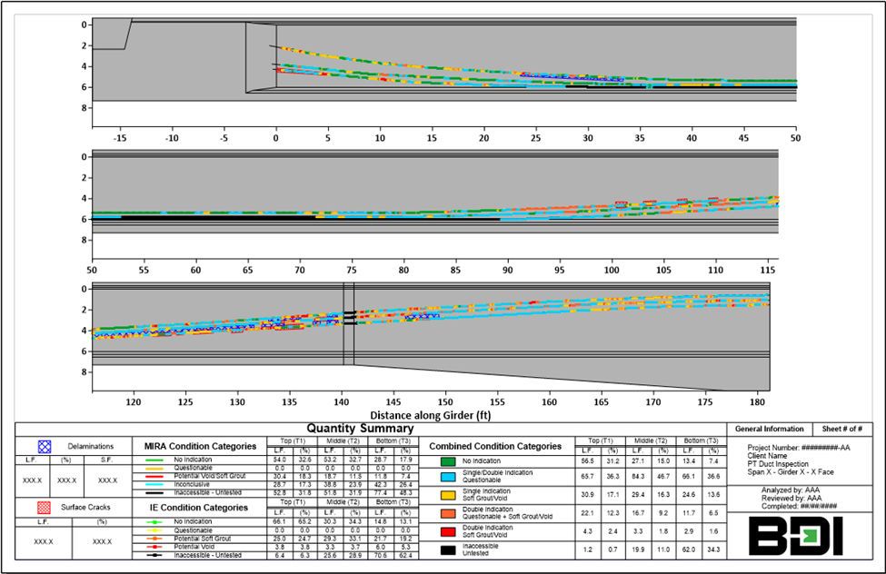 Imagine you have to report on the post-tensioned (PT) duct condition of 3 tendons in 8 girders for 10 spans with 2 faces, resulting in a total of 160 individual CAD sheets like the one presented above. Each sheet itself contains 3 different NDE condition overlays (Impact Echo, Ultrasonic Tomography – MIRA, IE+MIRA) presenting roughly 1,000 classification points each and presenting 110 unique values and measurements in each title block – that’s a total of 160,000 points and 17,600 values to present.